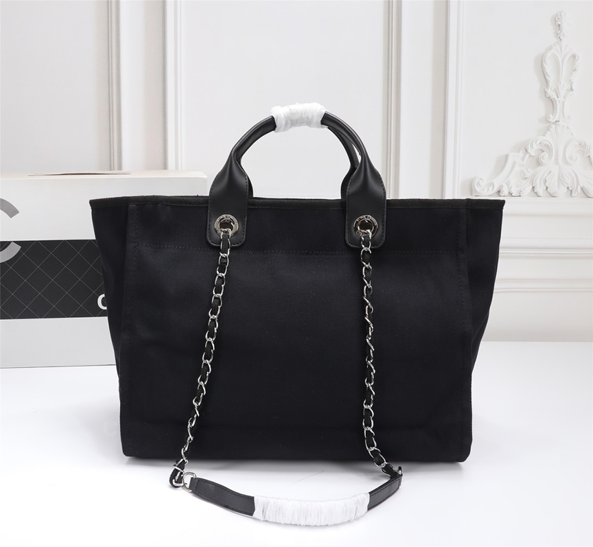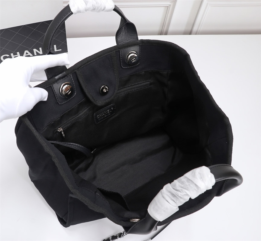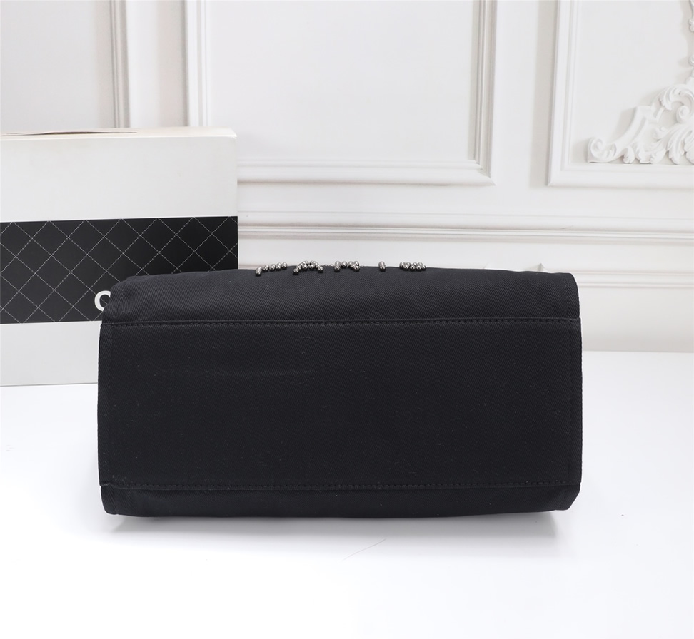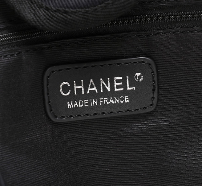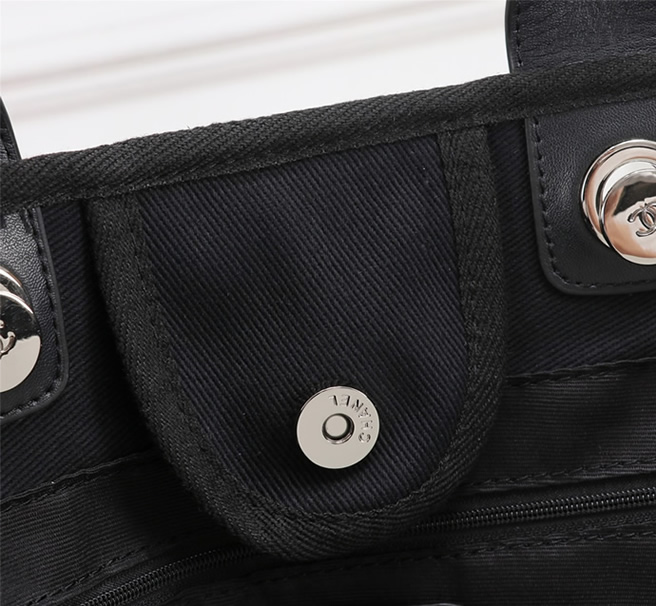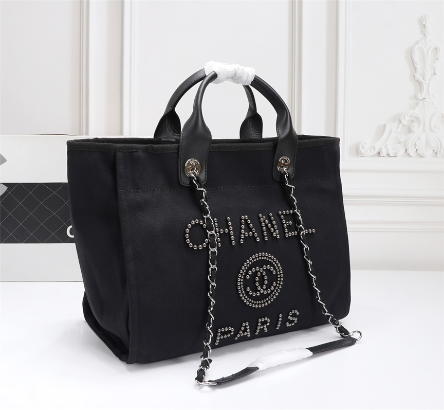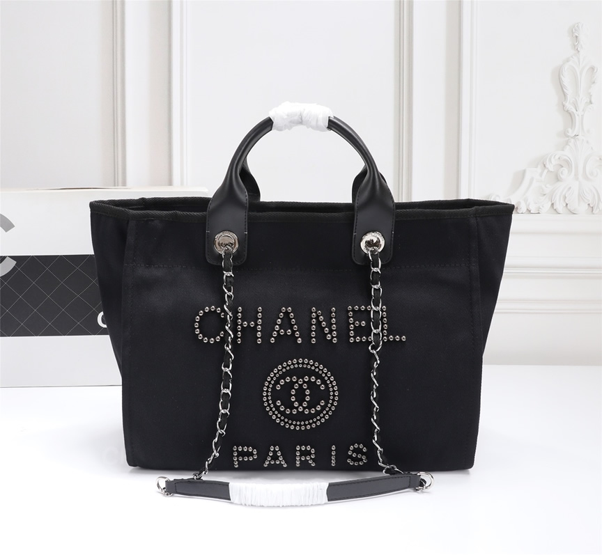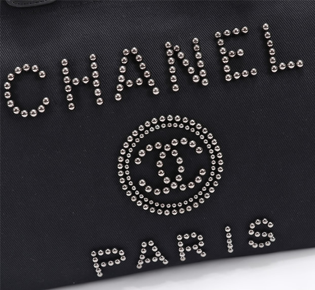 シルバートーンのスタッズで描かれた「CHANEL PARIS」ロゴとCCマークが際立つトートバッグです。