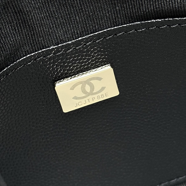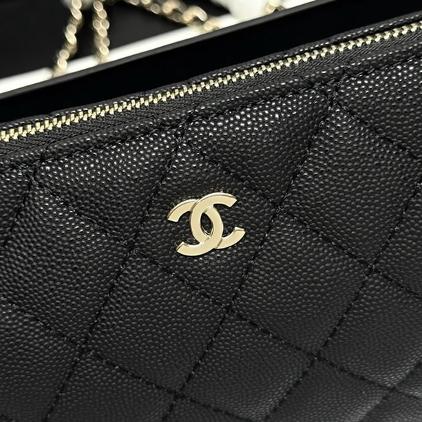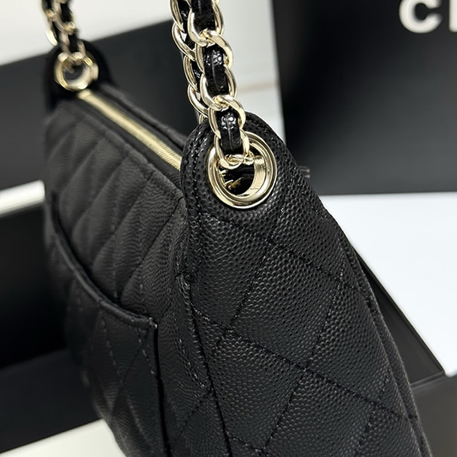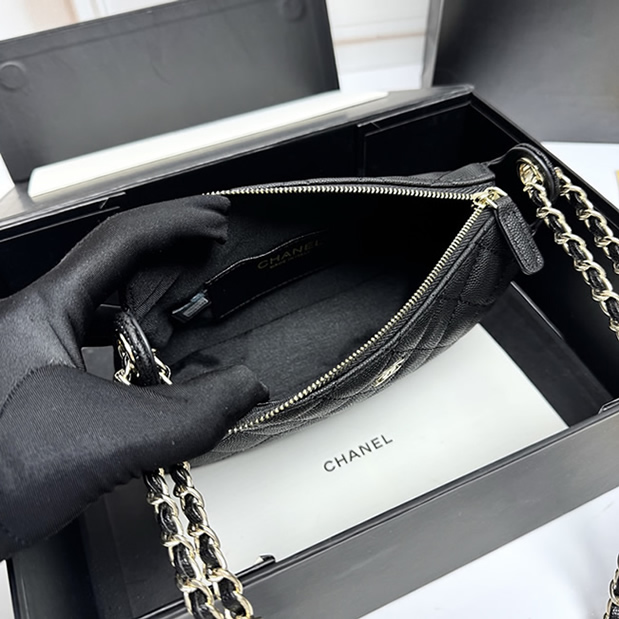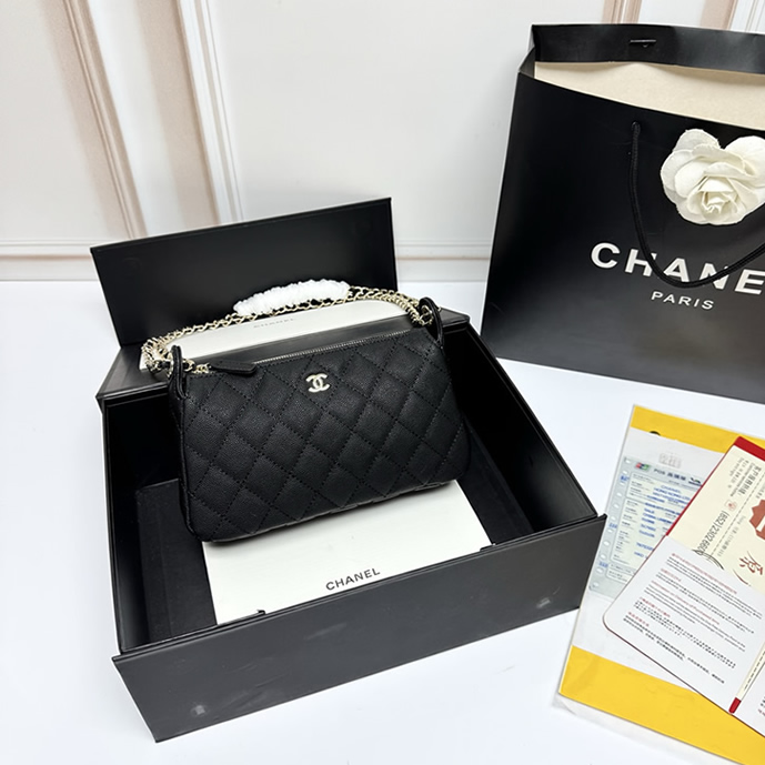 控えめに輝くシルバーのCCロゴが洗練された印象を与えます。取り外し可能なチェーンストラップ付きで、