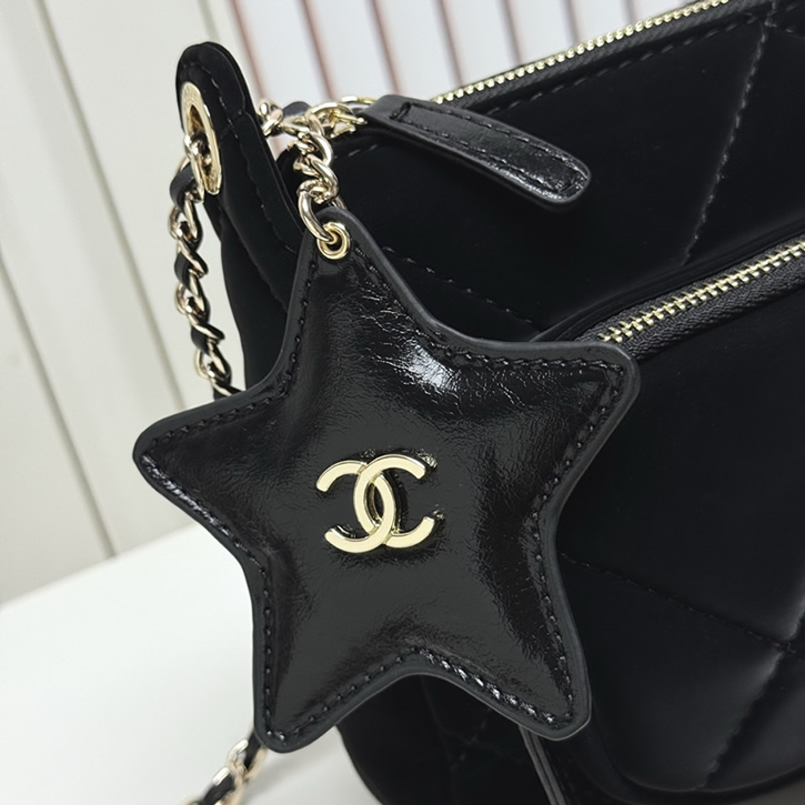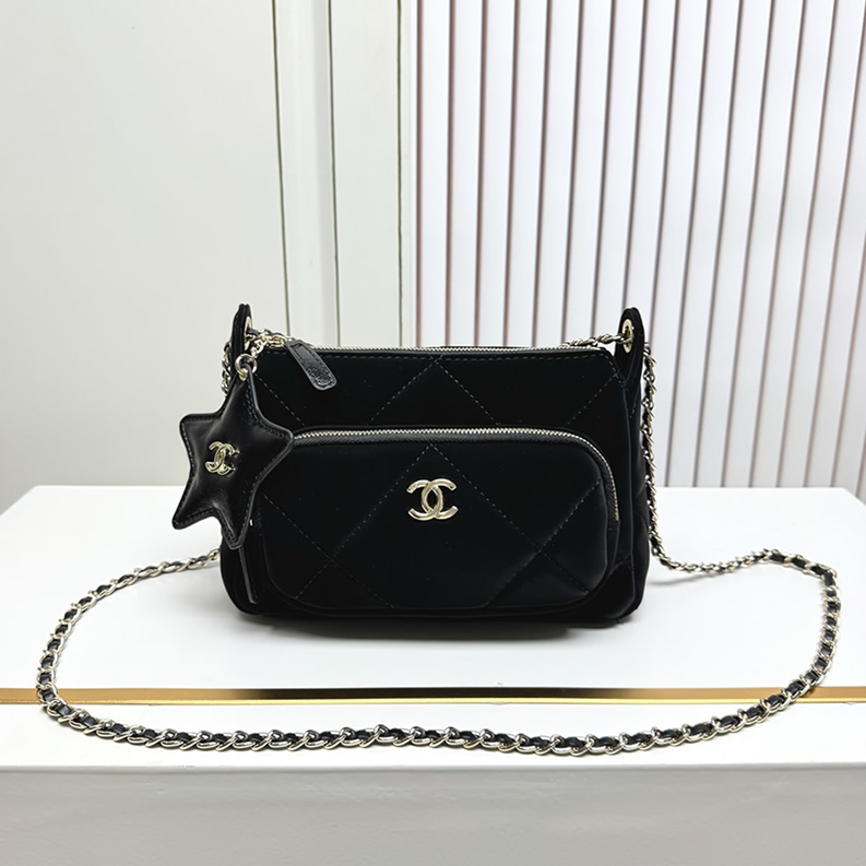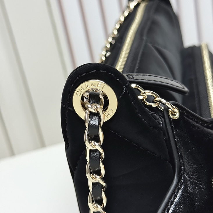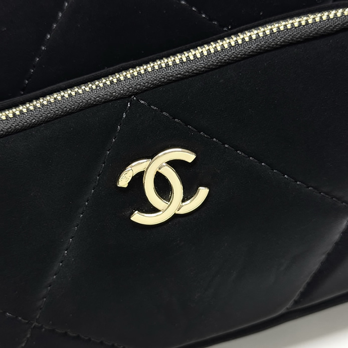 シャネルのダブルジップ チェーンバッグです。フロントのシルバーCCロゴと、