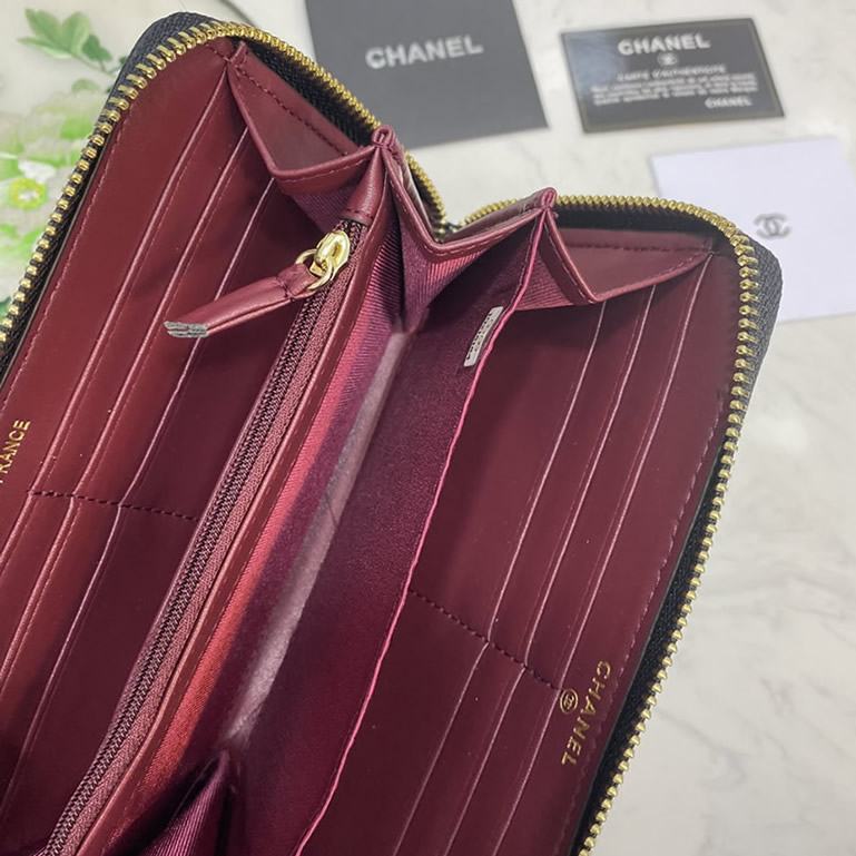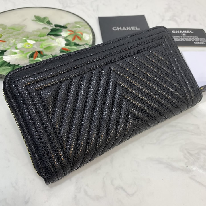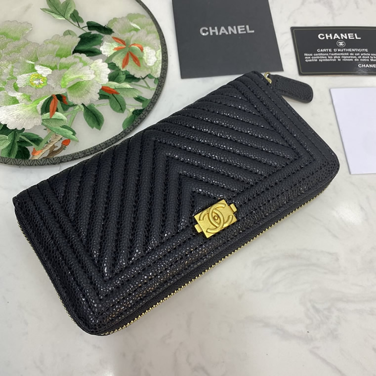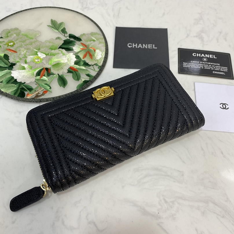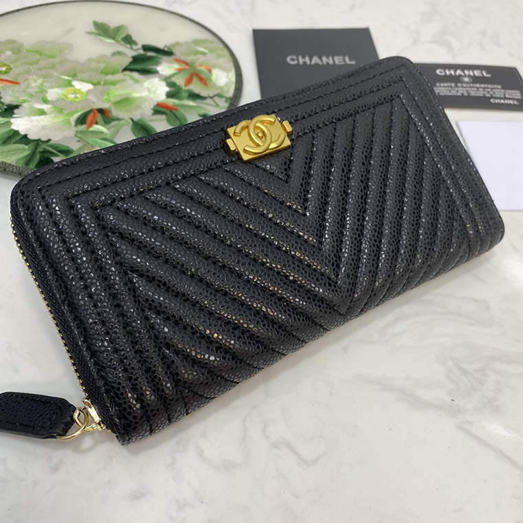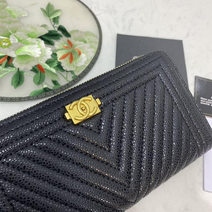 シャープなV字のステッチがパッと目を惹く「ボーイ シャネル」の長財布です。