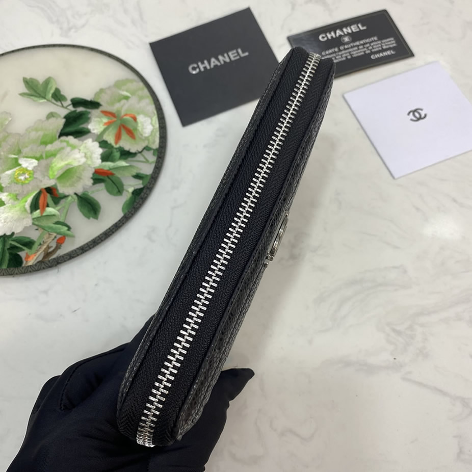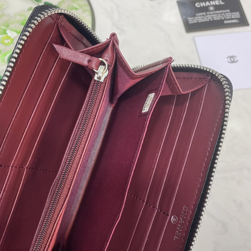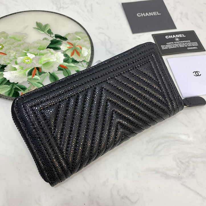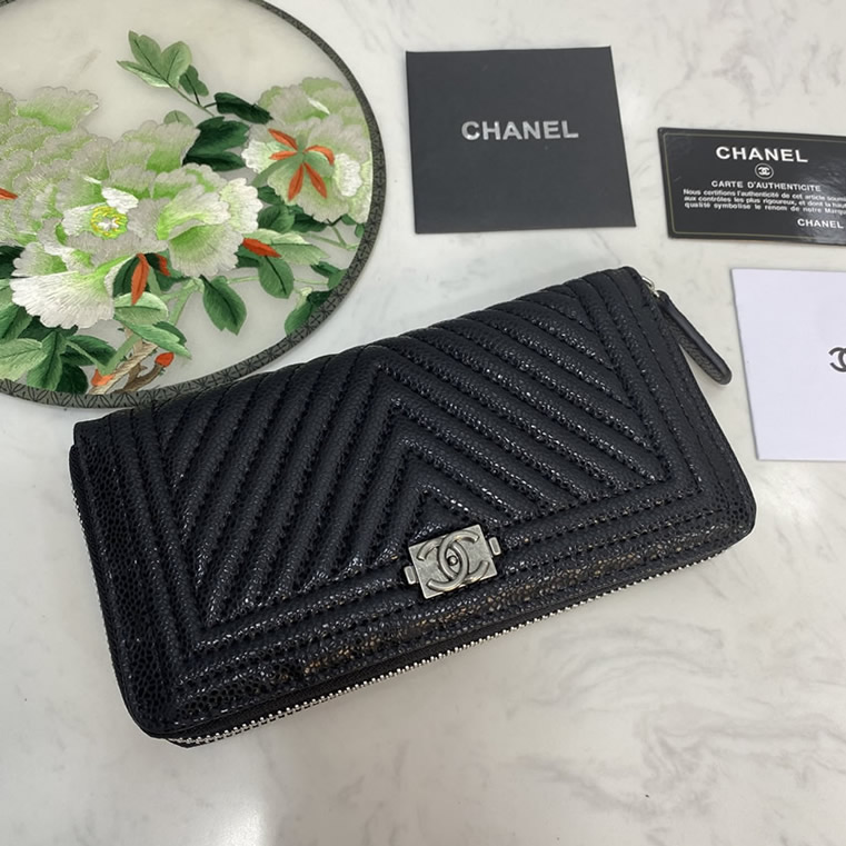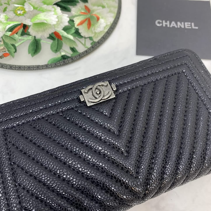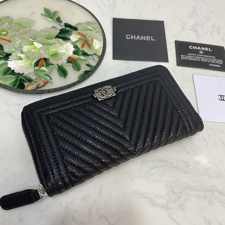 シャープなV字のステッチがパッと目を惹く「ボーイ シャネル」の長財布です。