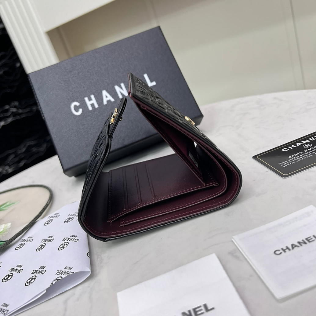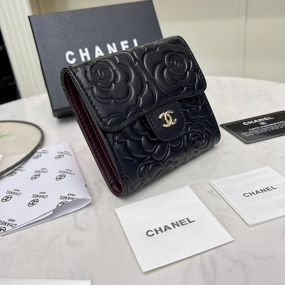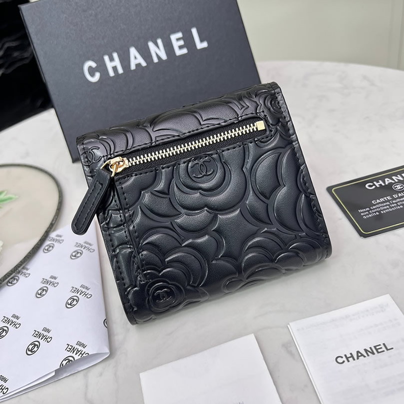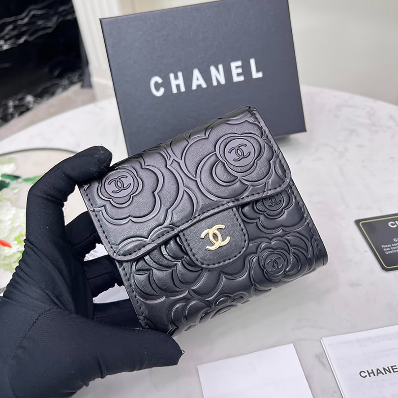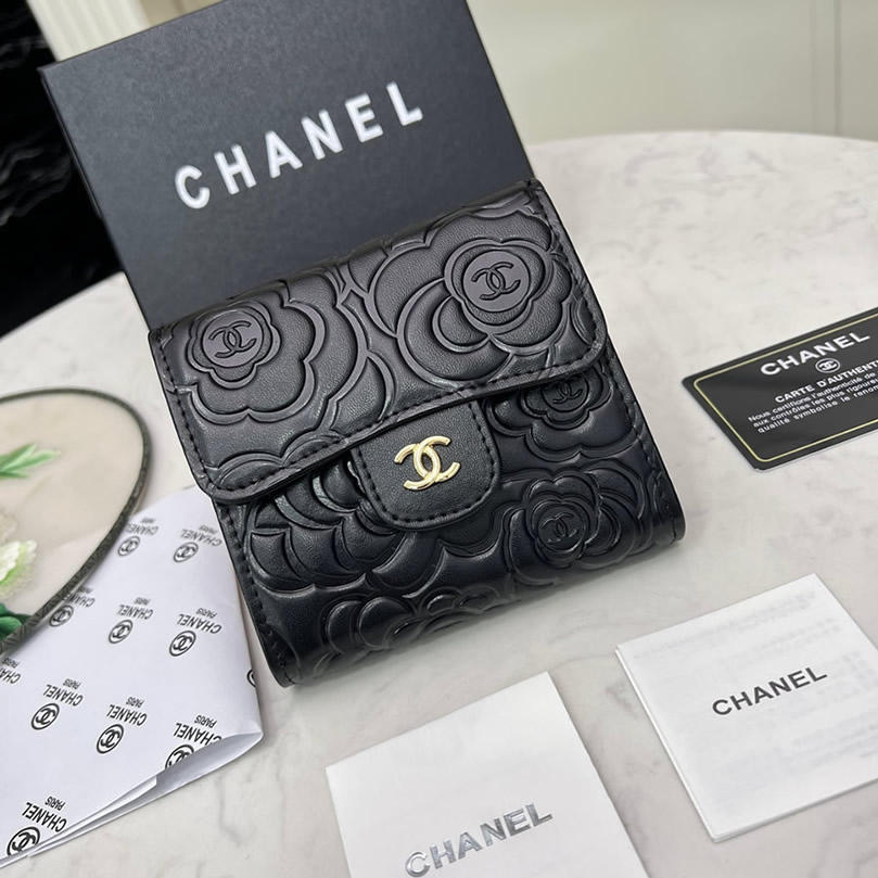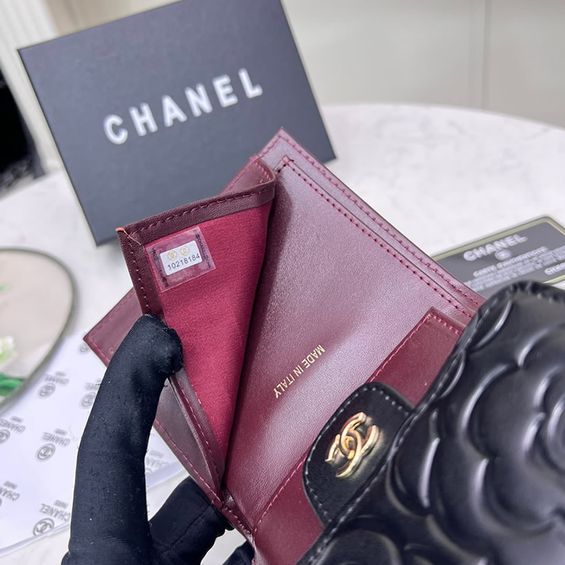 シャネル カメリア エンボス スモール フラップ ウォレット ラムスキン ブラック ゴールド金具 chg50086