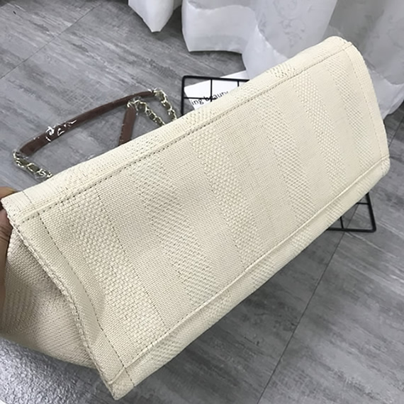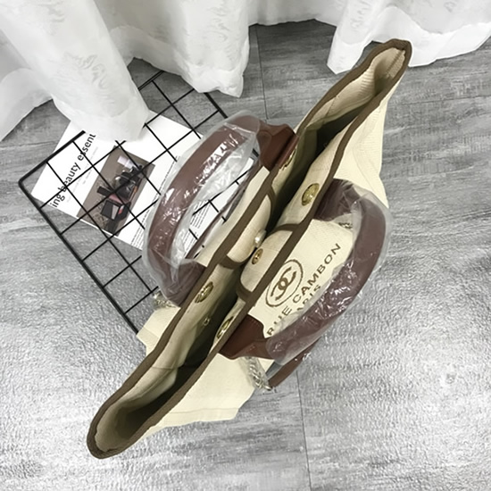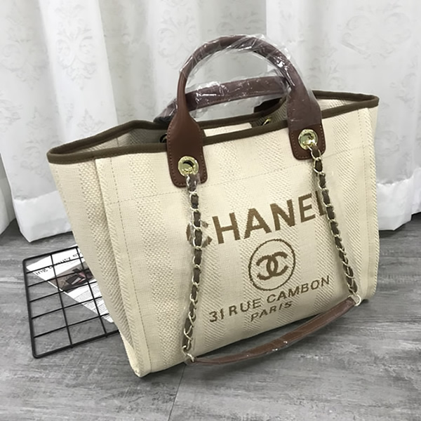上品なベージュのキャンバス素材に「CHANEL」のロゴが映える「ドーヴィル・トートバッグ」です。