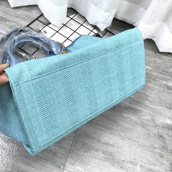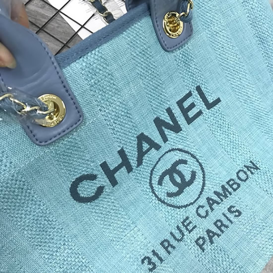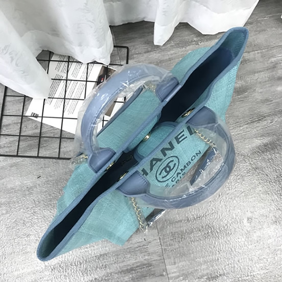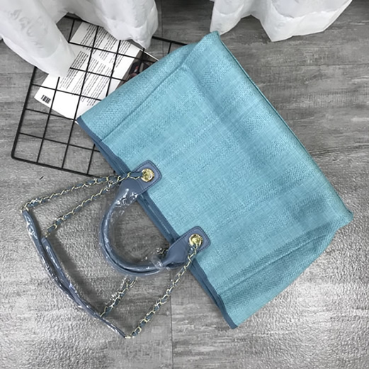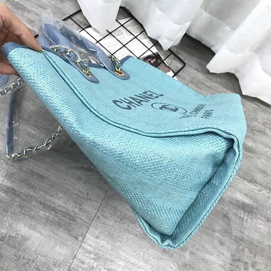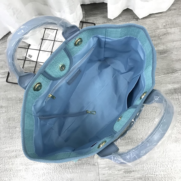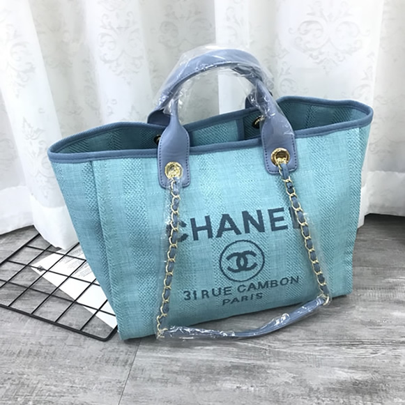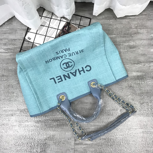爽やかなライトブルーのキャンバス素材に「CHANEL」のロゴが映える「ドーヴィル・トートバッグ」です。