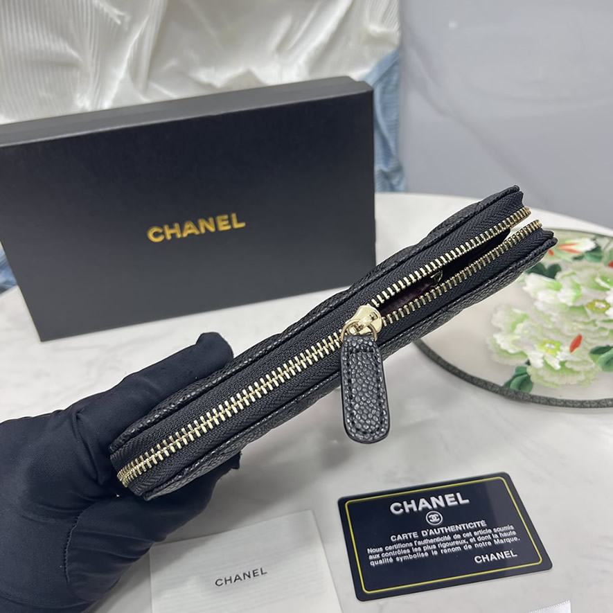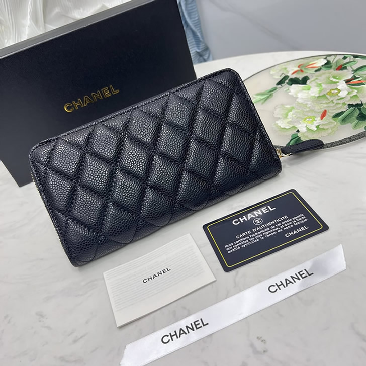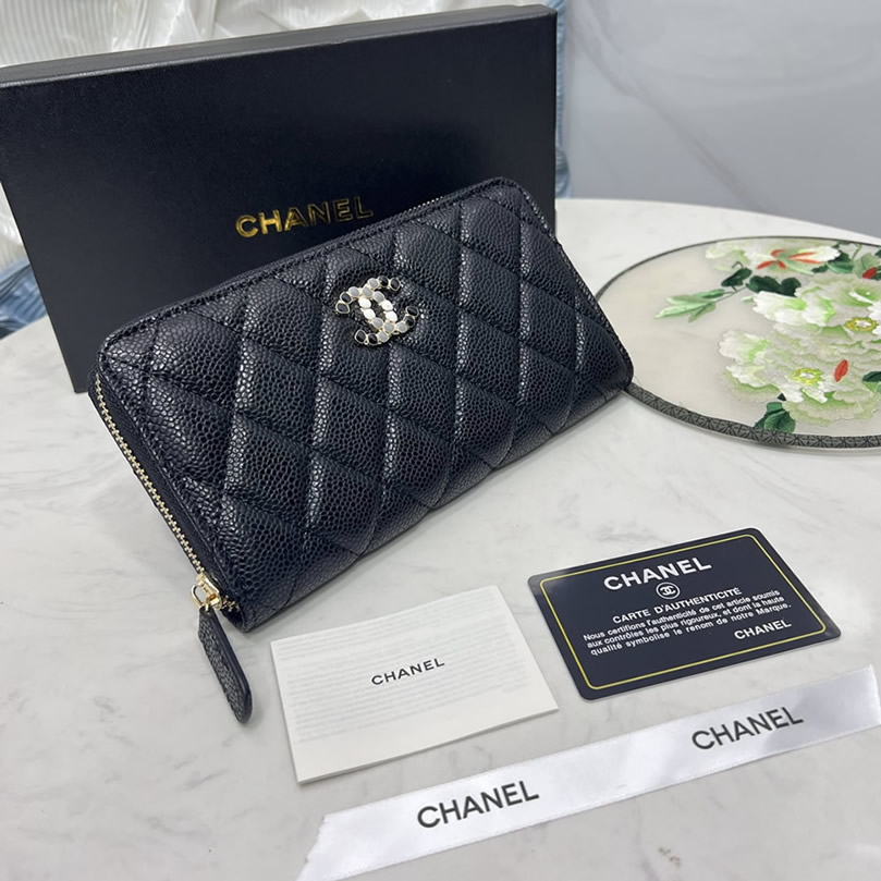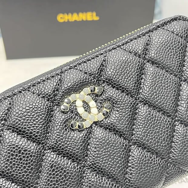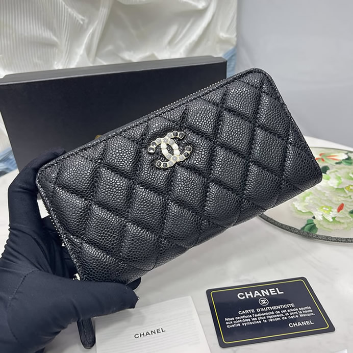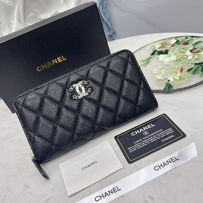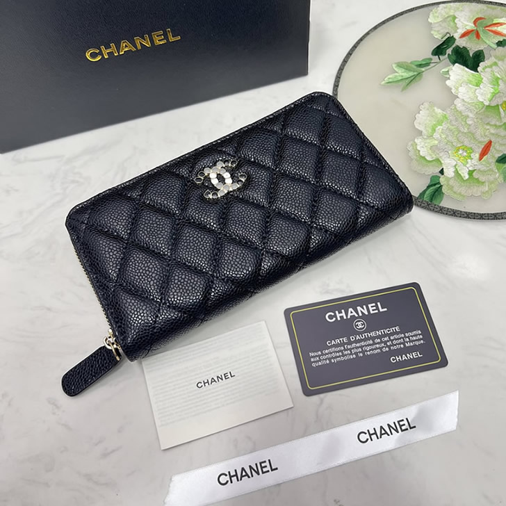 質感豊かなキャビアスキンに、コスチュームパールをあしらったCCロゴが特別な輝きを放つ「長財布」です。