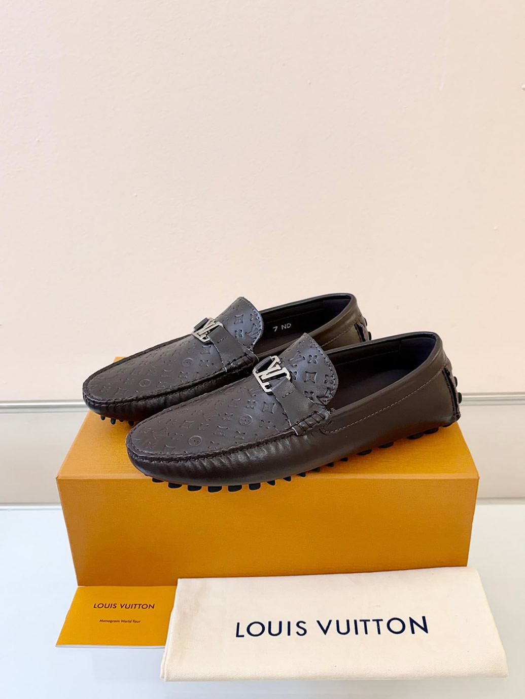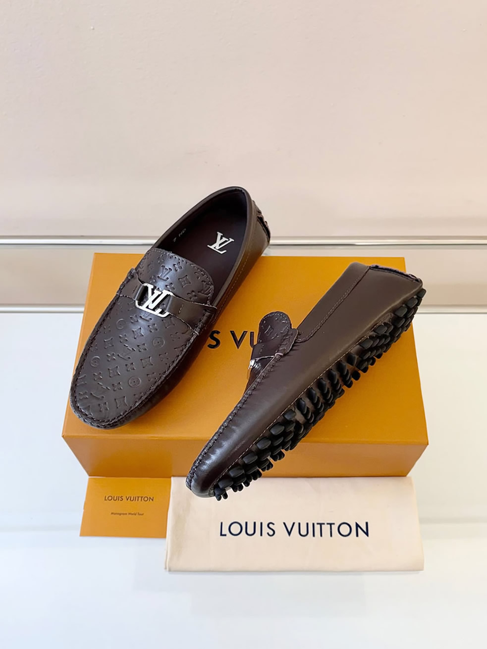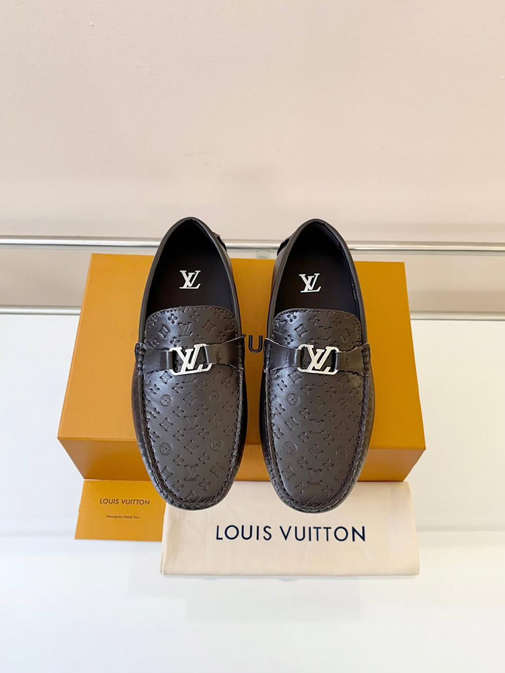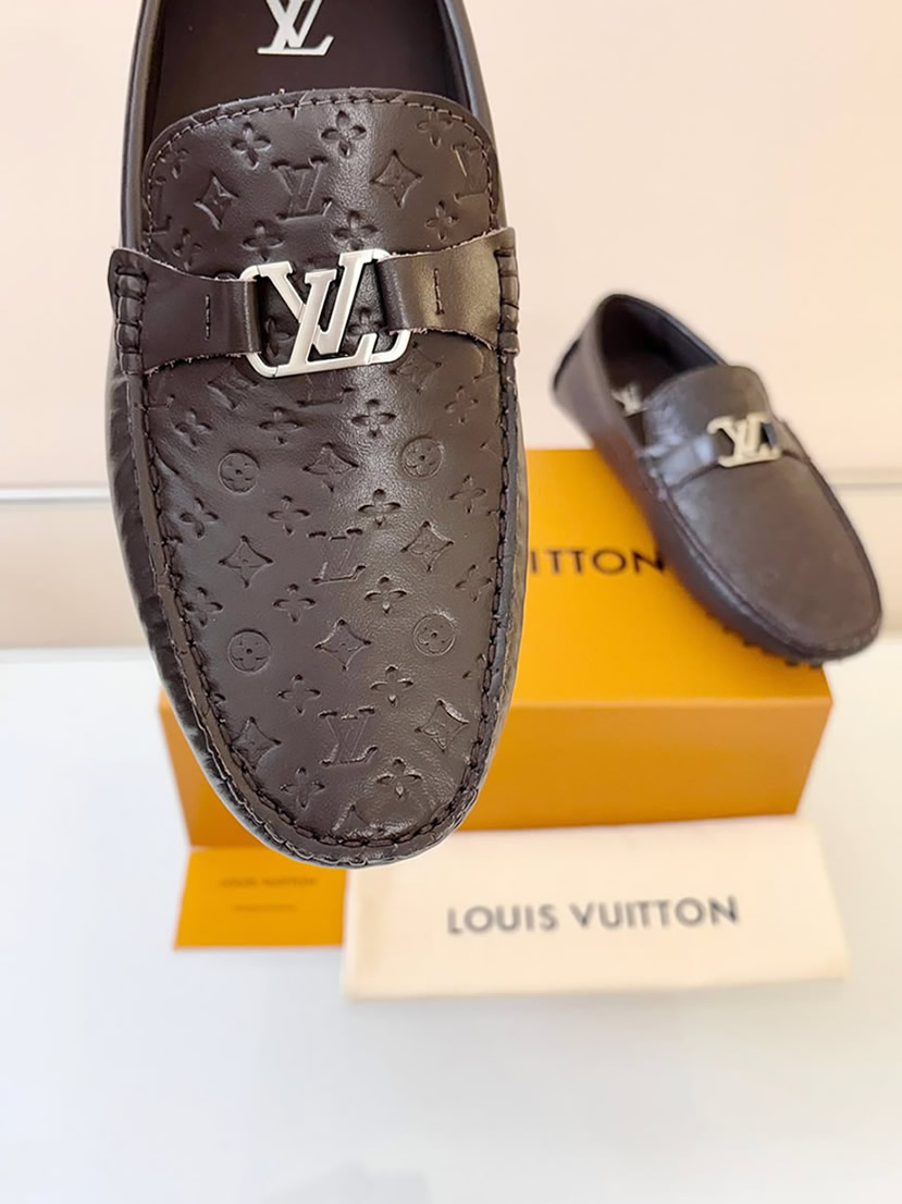 シルバーのLVロゴバックルが、足元に落ち着いた大人の品格をプラス。