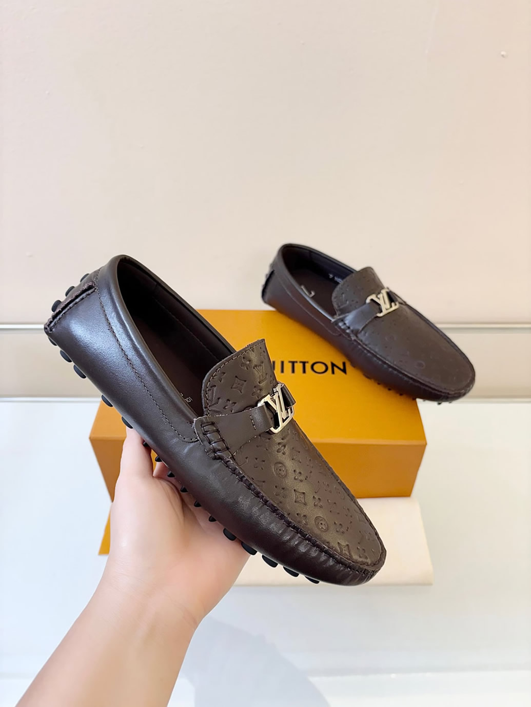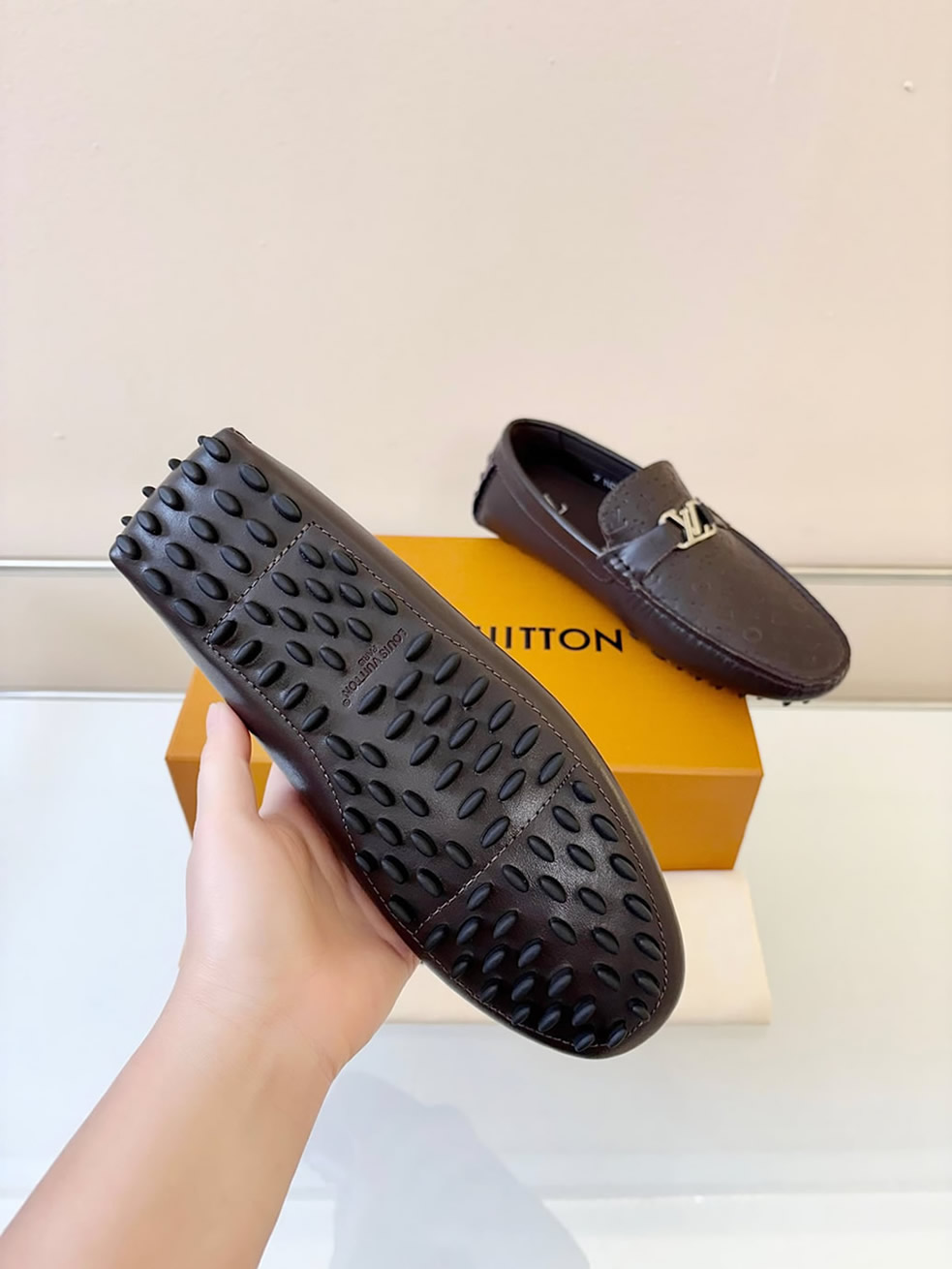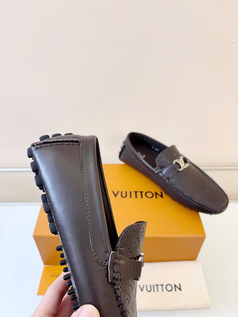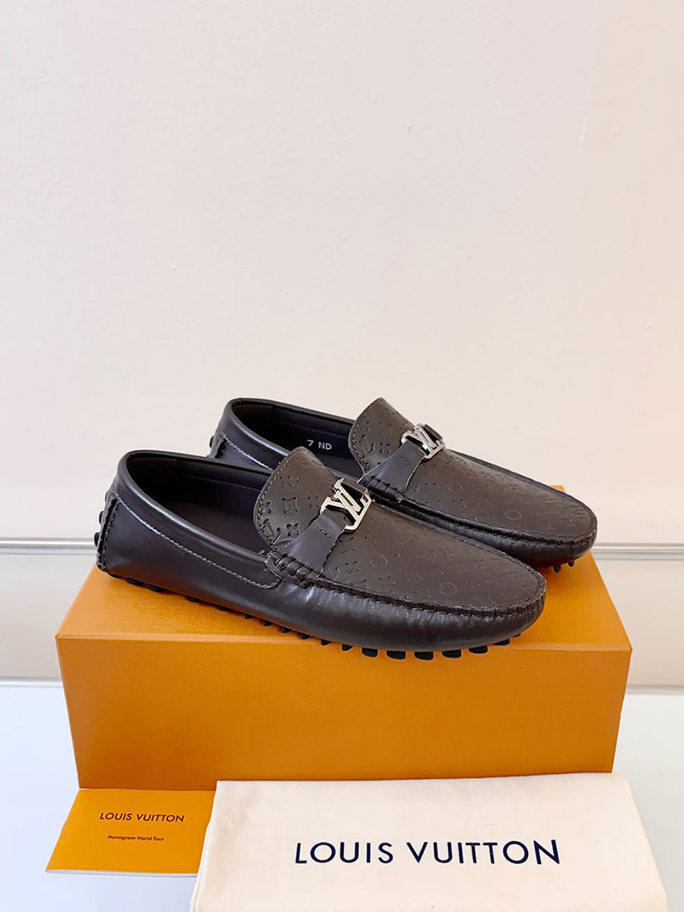 シルバーのLVロゴバックルが、足元に落ち着いた大人の品格をプラス。