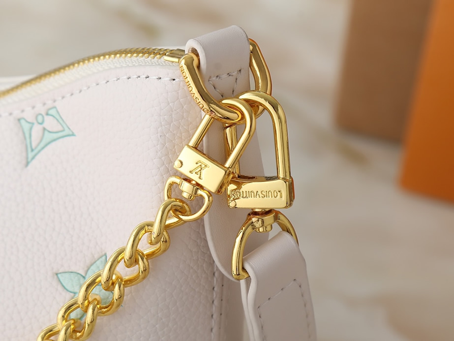 パステルブルーのモノグラム・パターンが繊細なエンボス加工で施された「イージー・ポーチ・オン・ストラップ」です。